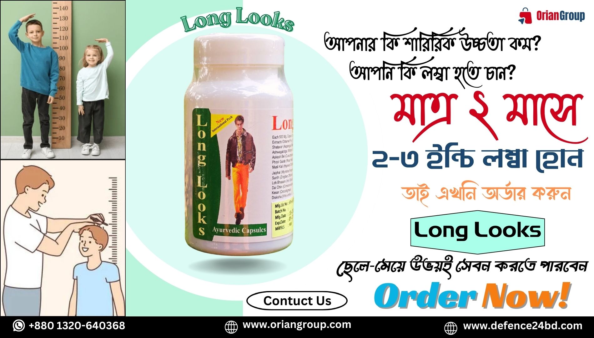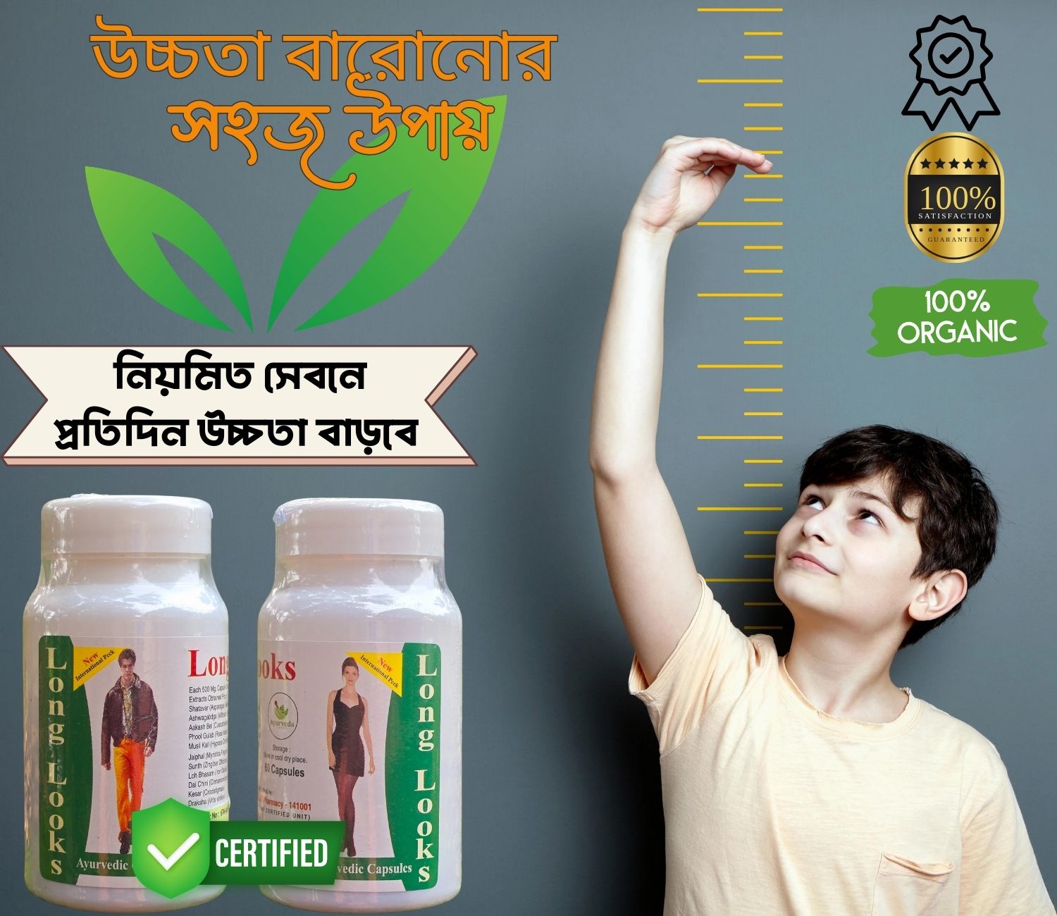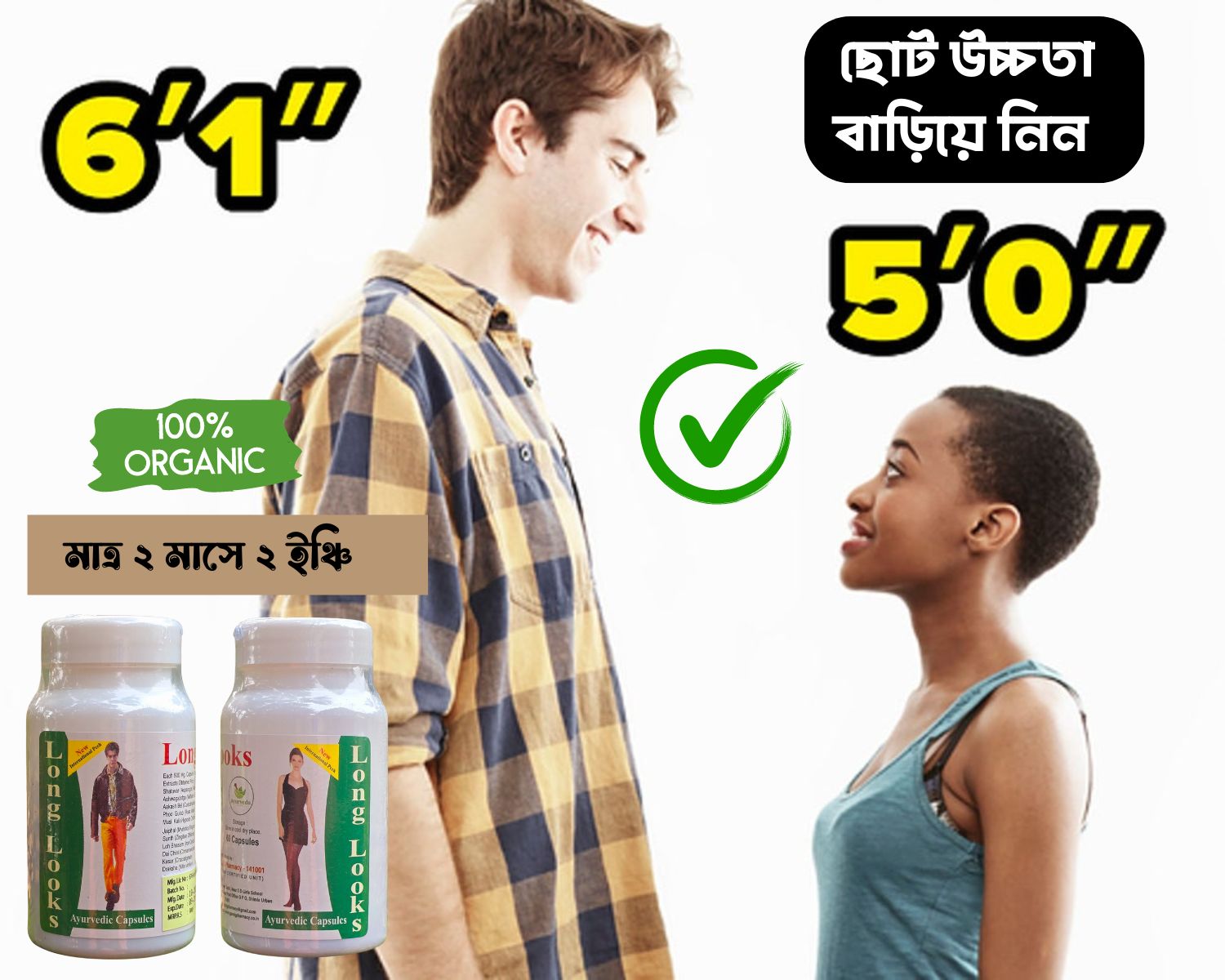 ছোট উচ্চতা নিয়ে আর কোন চিন্তা নেই এখন থেকে নিয়মিত লং লুকস সেবনে উচ্চতা বেড়ে যাবে ,সারা বিশ্বের শুধুমাত্র উচ্চতা বাড়ানোর জন্য ইন্টারন্যাশনাল ভেরিফাইড এই পণ্যটি রয়েছে |লং লুকস এটি মেডিক্যালি ভাবে পরীক্ষিত এবং এটি শরীরের জন্য কোনো ক্ষতি করে না